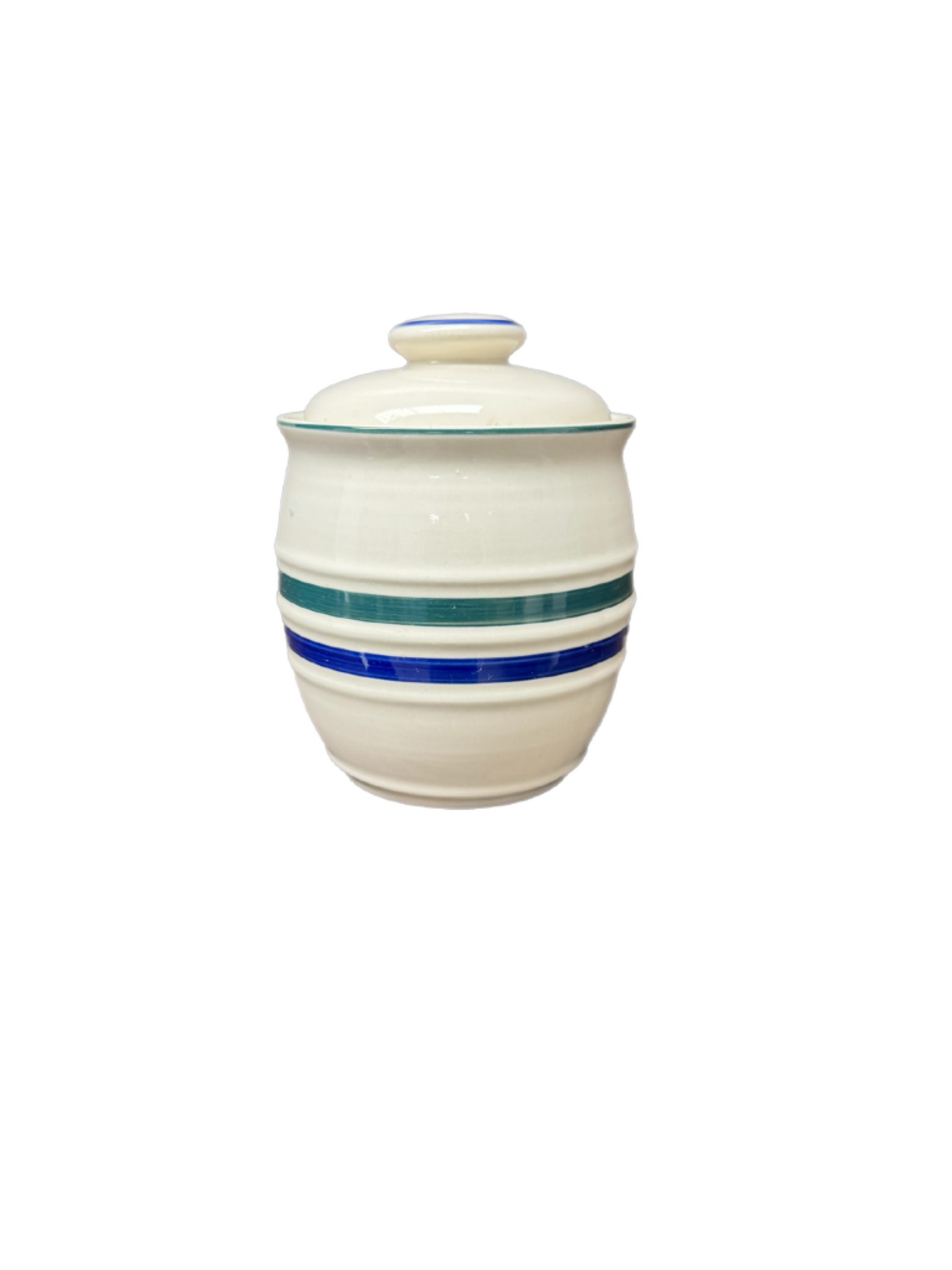 Large Ceramic Cookie Canister. Off White with Blue and Green strip.